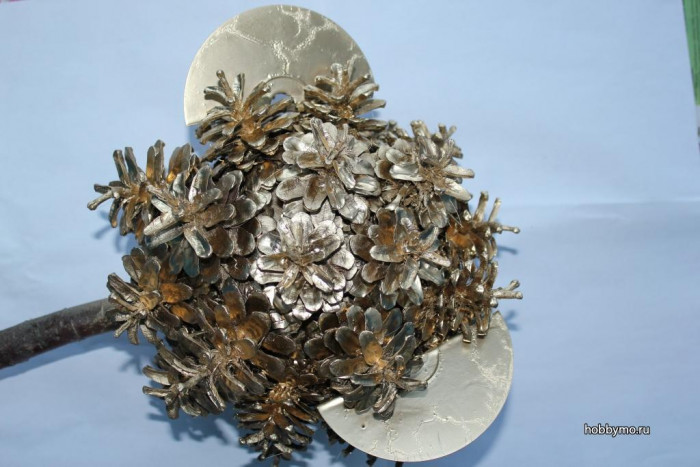 Приклеиваем шишки , и вставляем ветку дерева ,далее приклеиваем диск разрезанный на две части