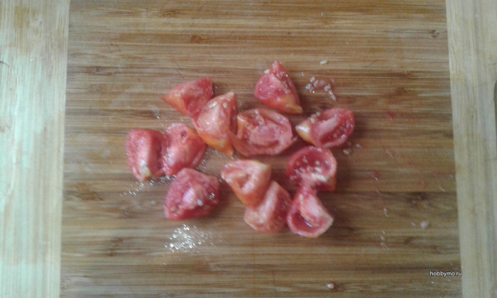 Одну среднюю помидору режем на дольки, у меня 3 мелких.