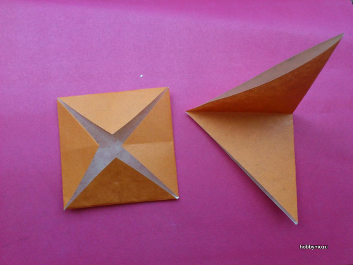 Шаг 2. Обе детали готовьте абсолютно идентично. Сначала выделите диагонали квадрата, согнув квадраты лицевой стороной наверх, если бумага с обратной стороны белая. Потом согните каждый угол к центру, четко ориентируясь на середины сторон.