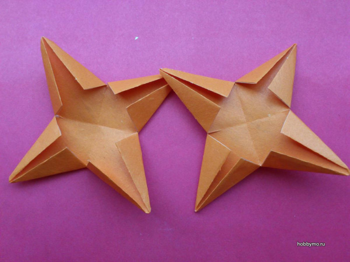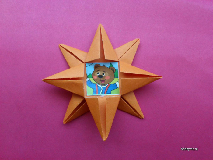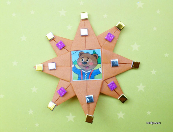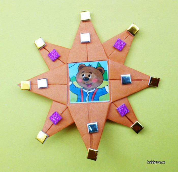 Шаг 6. Склейте звездочки между собой, повернув одну относительно другой на 45 градусов. В центр поместите детскую фотографию или изображение любимого сказочного героя. Зажмите поделку между книжками, чтобы бумага выровнялась и запомнила изгиб.
