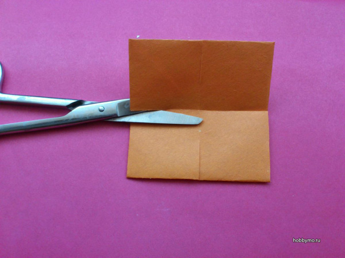 Шаг 3. Не разгибая уголки, сделайте четыре надреза от середины сторон к центру, но не доходите до самой центральной точки, а остановитесь на полпути.