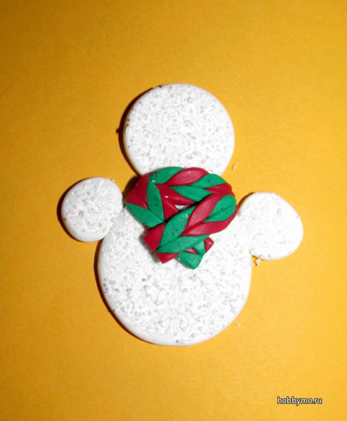 Из такого снеговика можно сделать брошку, кулон, магнит. Чтобы сделать кулон, сделайте вверху небольшую петельку для шнурка. Если вы хотите сделать брошку, то купите основу в магазине фурнитуры и приклейте ее на обратную сторону снеговика.
