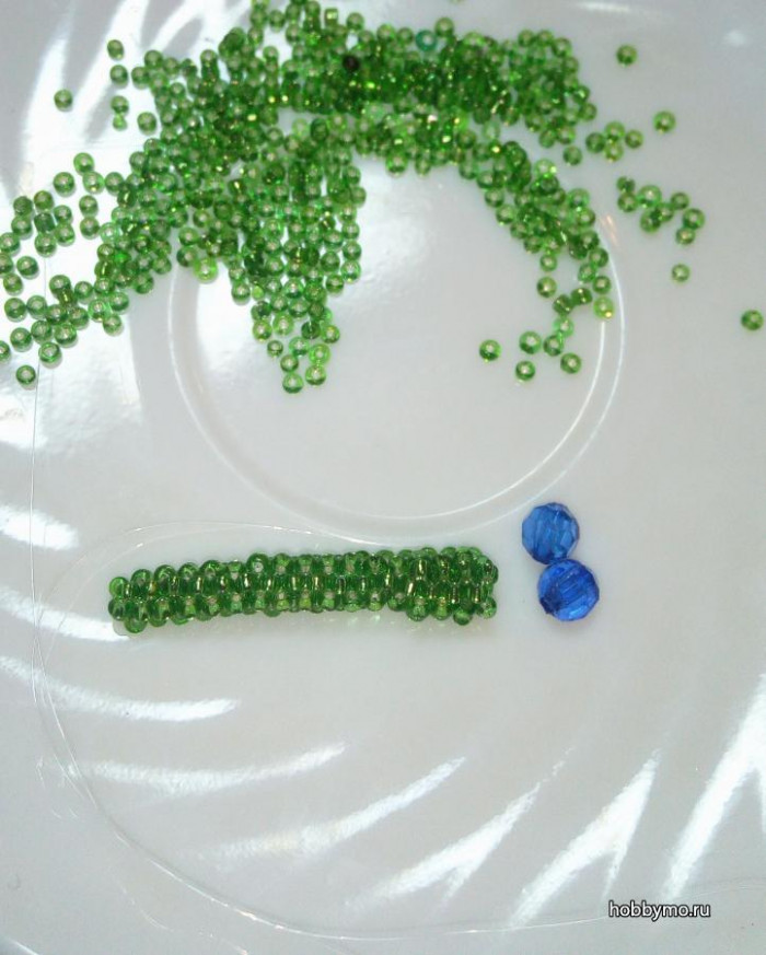 Затем делала утолщение, вместо одной бисеринки набирала 2. Т.е. один ряд из 2 бисерин, затем обычный ряд из одной бисерины...и так чередуем, продолжаем до нужной длины. Я плела так 4 ряда.